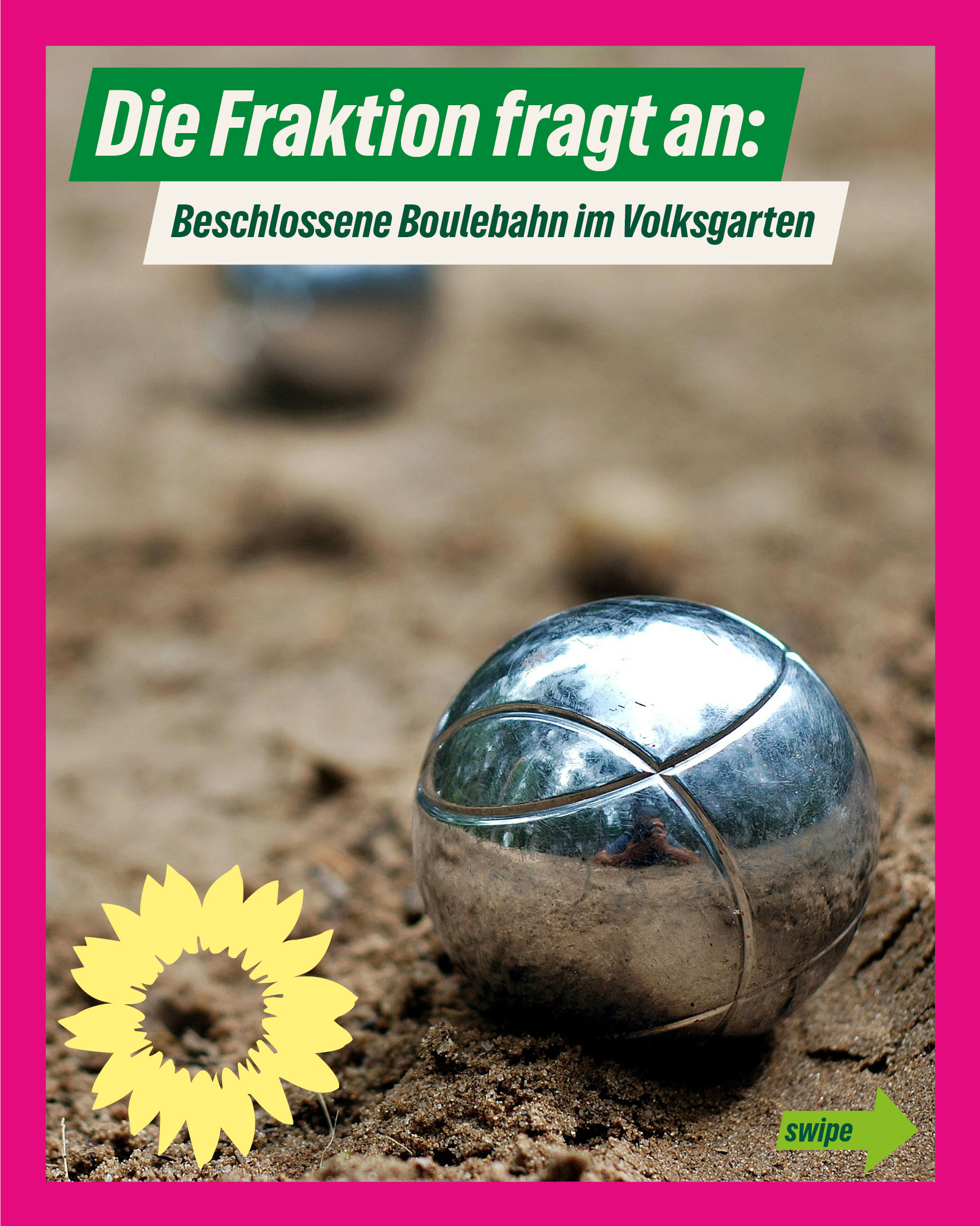 Die Fraktion Bündnis 90/Die Grünen setzt sich dafür ein, dass die zusätzliche Boulebahn schnellstmöglich realisiert wird, um dem gewachsenen bürgerschaftlichen Engagement und der steigenden Beliebtheit dieser Freizeitaktivität gerecht zu werden.