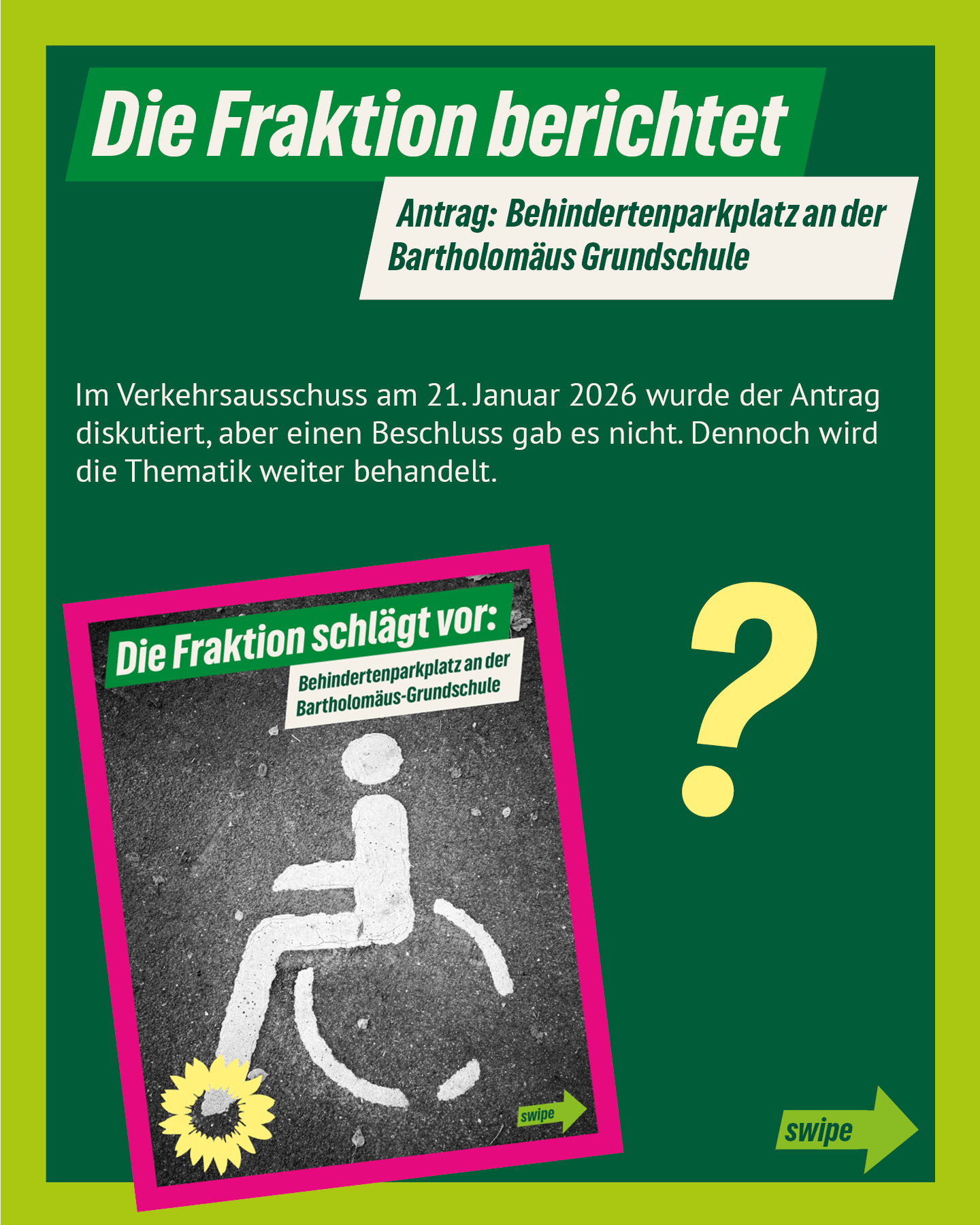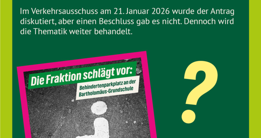 In der letzten Sitzung des Verkehrsausschusses haben wir unseren Antrag (Kurzzeit Behinderten Parkplatz an der Bartholomäus Grundschule) erneut begründet und dabei die Vorzüge des Standorts an der Voedekestraße gegenüber den Schwächen des Lehrerparkplatzes dargelegt.